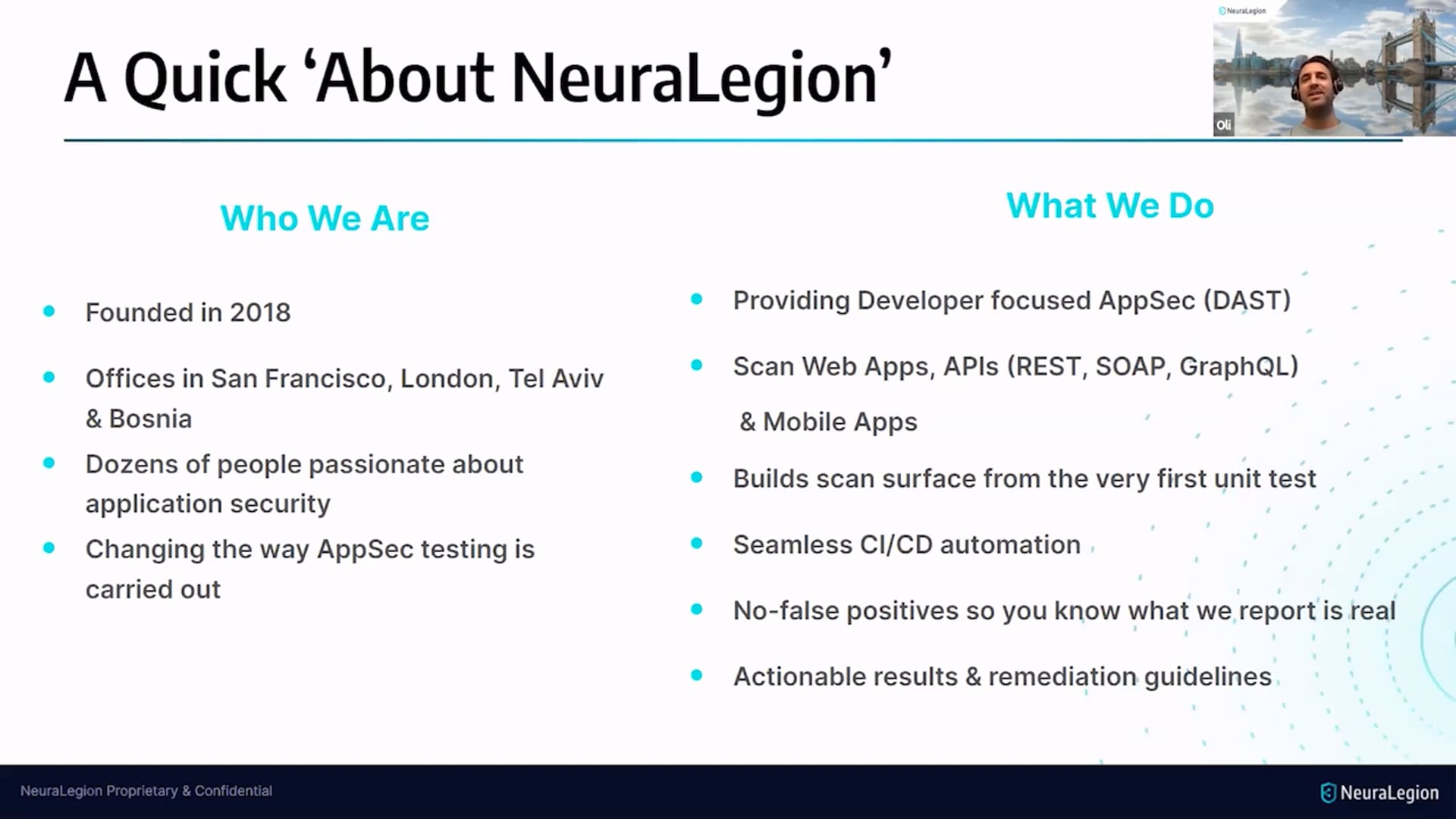 NeuraLegion's developer-first Dynamic Application Security Testing (DAST) scanner enables developers to detect, prioritise and remediate security issues EARLY, on every commit, with NO false positives/alerts, without slowing you down.